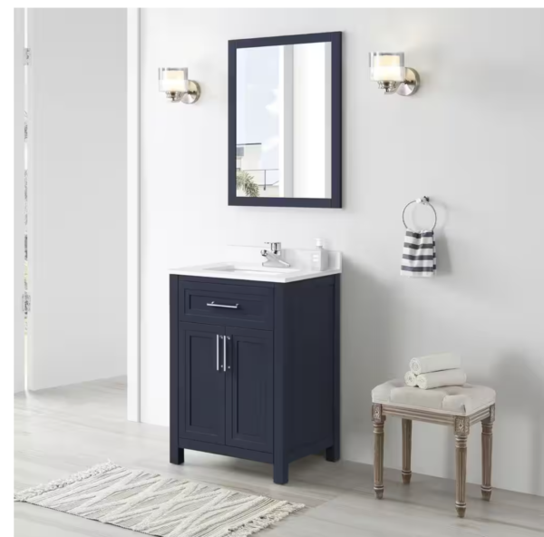 Elevate your bathroom’s aesthetic with the Beaufort 24-inch Single Sink Vanity from the Home Decorators Collection. This vanity combines a rich Midnight Blue finish with a pristine white engineered stone top, offering a sophisticated and functional addition to your space.
