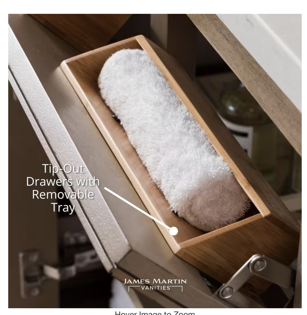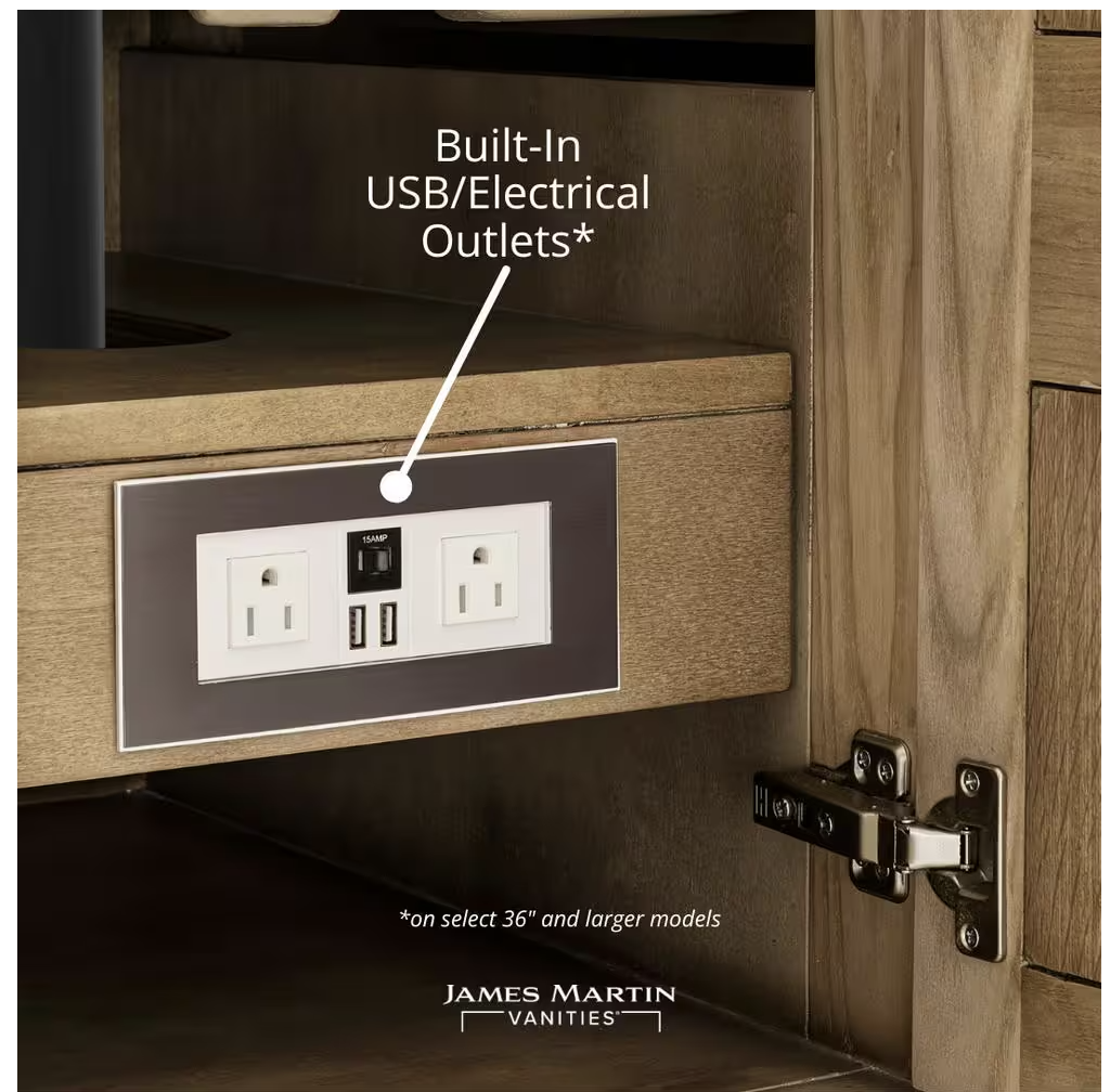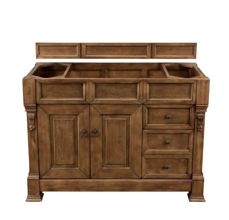 The Brookfield 48 in. vanity by James Martin Vanities features hand carved accenting filigrees and raised panel doors. 2 doors open to shelves for storage below and 2 drawers, made up of a lower double-height drawer and a middle standard drawer, offer additional storage space. Antique Brass finish hardware, decorative wood backsplash, door, and drawer pulls included. This collections is offered in a variety of different finishes. Each cabinet is configured to work with a large selection of our vanity tops.